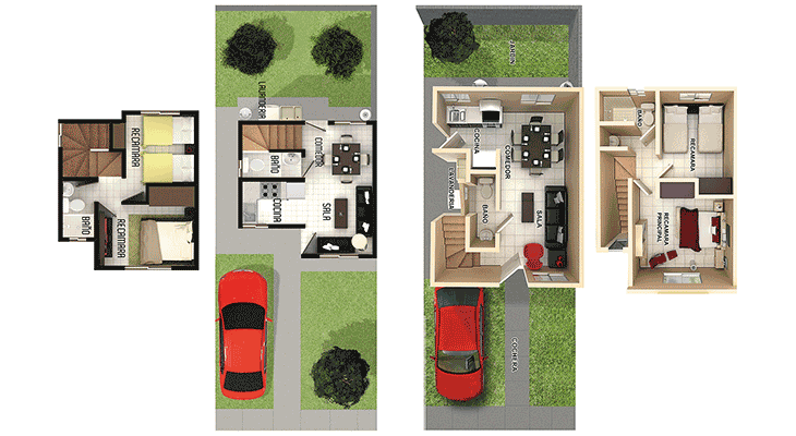 Podrás encontrar casas de 2 recamaras con una arquitectura mexicana contemporánea y distintas fachadas que las hacen lograr una identidad propia pero al mismo tiempo logrando una integración de paisaje muy agradable a la vista.